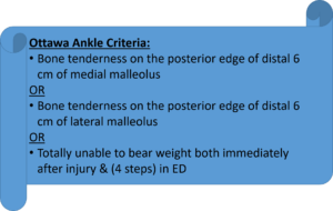 That is often the first question asked about an ankle injury. Unless you have x-ray eyes, you don’t have that immediate answer. Yes, a radiograph is the answer. However, there are clinical tests that can help you determine if a radiograph is really necessary. In 1992, Stiell et al conducted a pilot with 155 adults and a main study with 750 adults. All experienced acute ankle injuries. They identified the clinical variables capable of predicting fractures and/or the need for radiographs. What they found was that all 70 malleolar fracture identified in 689 ankle radiographs identified pain near the malleoli, were over 55 years of age, had local tenderness on the posterior edge or tip of the malleoli, or were unable to bear weight immediately/in the emergency room. Using these rules, the sensitivity was 100% and specificity was 40%. Equally impressive is the fact that using these “rules” would allow for a reduction of 36% of radiographs ordered. Further studies fine-tuned these “rules” to become the Ottawa Ankle and Ottawa Foot Rules.