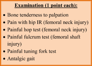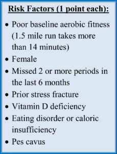 High risk structures include femoral neck, anterior tibia, medial malleolus, navicular, talus, proximal 2nd and 5th metatarsals, patella, and toe sesamoids. Interpretation of the BSI score is as follows: a score ≥ 4 and at least 1 examination finding. If this criteria is achieved, radiographs should be obtained and activity/weight bearing should be restricted.