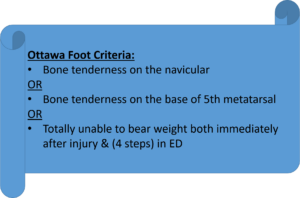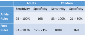 As per the statistical data, one can see from the low specificity, the Ottawa Rules are not intended to be diagnostic of a fracture. The high sensitivity tells us they are designed be a reliable screening tool to determine if a radiograph is needed. Fortunately, radiographs have a specificity of 88% – making them a strong diagnostic tool.
