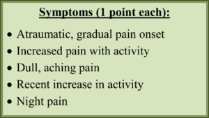 Not all bone injuries are displaced fractures. Bone stress injuries (BSI) are the inability of a bone to withstand repetitive loading. Nye et al (2016) developed an algorithm to improve diagnostic accuracy of suspected bone injuries. These include Risk Factors, Symptoms, and Examination elements.