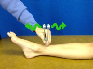 A 1-MHz frequency ultrasound transducer at 2.0 w/cm2 for 30 seconds over the region of the suspected stress fracture can be used to reproduce pain. This would be deemed a positive test. Again this technique a specificity of 67% but a (+) predictive value of 99%. Sensitivity is 82% with a (-) predictive value of 13%.