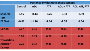 Aside from the external rotation test, there is no sensitivity or specificity reported for the syndesmotic tests. However, a study conducted by Beumer et al (2003) looked at the different tests for the syndesmotic ankle instability, with the purpose of determining the best tests to identify laxity. With the systematic sectioning of precise ligaments, they looked at the squeeze, the fibular translation, the cotton, the external rotation, and the anterior drawer. The charts below summarize the data for anterior and posterior displacement of the syndesmosis. Data reveals the External Rotation Test produces the most anterior gapping while the Cotton, Fibular Translation, and Anterior Drawer tests produce similar magnitudes of posterior gapping.