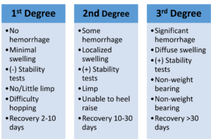 Symptoms include edema, pain, ecchymosis, and possibility instability. The magnitude of the symptoms are used to classify the sprain as grade I, II, or III. The chart below summarizes the grades: