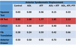 Aside from the external rotation test, there is no sensitivity or specificity reported for the syndesmotic tests. However, a study conducted by Beumer et al (2003) looked at the different tests for the syndesmotic ankle instability, with the purpose of determining the best tests to identify laxity. With the systematic sectioning of precise ligaments, they looked at the squeeze, the fibular translation, the cotton, the external rotation, and the anterior drawer. The charts below summarize the data for anterior and posterior displacement of the syndesmosis. Data reveals the External Rotation Test produces the most anterior gapping while the Cotton, Fibular Translation, and Anterior Drawer tests produce similar magnitudes of posterior gapping.