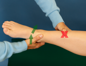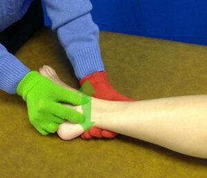 To test the lateral ligaments, the anterior drawer and talar tilt are the primary tests. The anterior drawer test stresses for ATF to determine laxity. The ATF connects the tibia and the fibula so displacing the calcaneus anterior on the stabilized tibia-fibula will incriminate this ligament. To perform this test, the patient is in supine with the distal tibia/fibula stabilized and the posterior calcaneus/talus grasped to translate anterior on tibia/fibula, i.e. distal moved on proximal. A positive test is pain and/or excessive gapping. You should also note, the presence of a “dimple” anterior to the tip of the lateral malleous during the drawer test is a positive indication of an ATF ligament rupture. This “dimple” is the result of negative pressure created by anterior displacement of the talus drawing the skin inward.