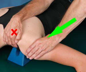 To perform an anterior glenohumeral glide, the patient is positioned in prone.  A wedge/towel roll should be place under the anterior chest/clavicle, medial to the glenohumeral joint line.  This lifts the chest off the plinth and permits room to glide the humerus anterior.  The scapula is stabilized proximally (X) and the web space of the clinician’s hand contacts the humeral head to perform an anterior medial glide (Hint: Remember orientation of the humerus in the glenoid fossa).  Once again, one needs to attend to the alignment of the forearm relative to the desired motion.  The same positioning and technique using the MobilAider is Mobil-Aider Anterior Glidedisplayed to the right.