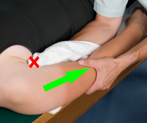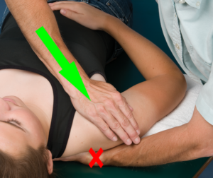 To perform an inferior glide to improve elevation, the clinician drapes his/her hand with a towel or pillow case.  The patient rests in the supine position with the involved upper extremity (UE) over the edge of the plinth.  The clinician places the web-space of the draped hand in the axilla for stabilization (X).  Note the posterior border of the clinician’s forearm presses against the patient’s rib cage to enhance stability.  The other hand grasps the distal humerus to impart an inferior glide of the humerus on the glenoid socket.  Note the parallel alignment of the clinician’s lateral arm and the patent’s humerus (Wise & Gulick, 2009).