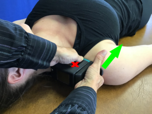 Mobil-Aider Posterior GlideWhen the MobilAider is used for a posterior glide, the blue (H-D) attachment is donned.  The joint line is identified, the device is aligned with the joint line and the same technique is performed.  The magnitude of the posterior oscillations can be observed on the screen to discern the linear translation performed relative to the total translation, i.e. grade of mobilization.