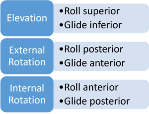 Let’s explore the actual mechanics of shoulder mobilizations and the related literature.  The shoulder is one of the most mobile joints of our bodies.  The chart below summarizes the arthrokinetic motions for each respective osteokinematic movement: